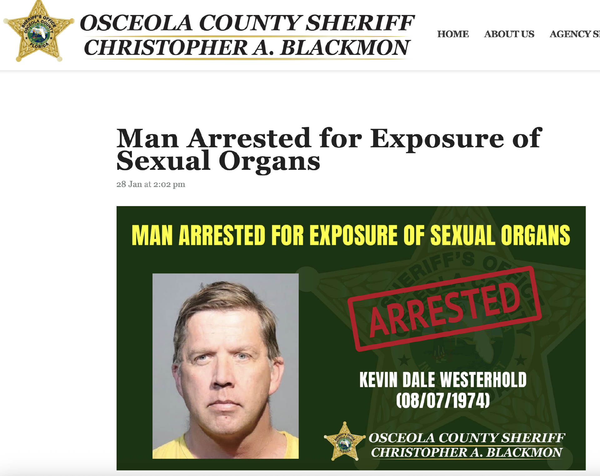 2026年1月22日,奥西奥拉县治安官办公室的警员接到报案,前往基西米温莎希尔斯度假村的 Grassendale,调查一名男子在住宅前暴露身体的投诉。