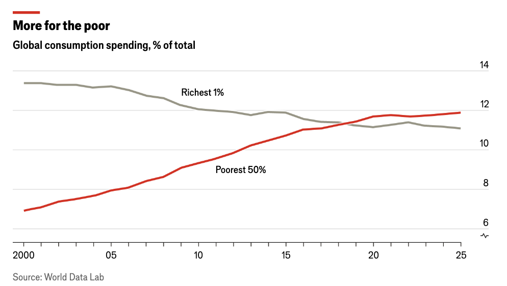 根据研究机构世界数据实验室(World Data Lab)于1月20日发布、涵盖194个国家和经济体的数据显示,全球最富有的10%人口与最贫困的50%人口之间的消费支出比例自2000年以来已缩减了一半以上。