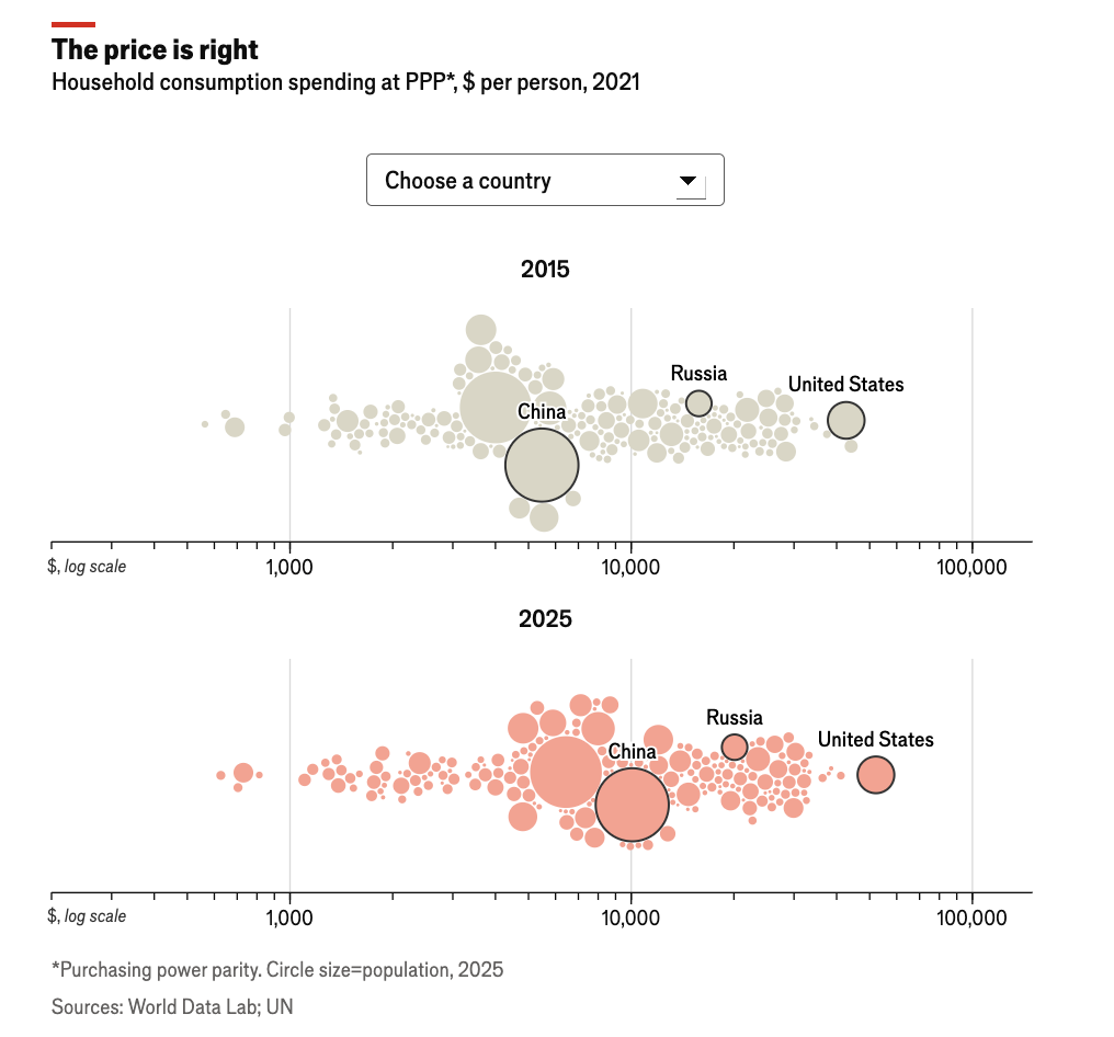 比如,过去25年里,美印两国的平均消费支出比例发生了巨变:原本美国人的支出是印度人的16倍多,现在这个差距已经缩减到不到8倍。