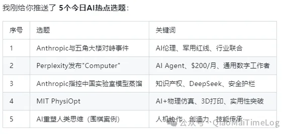 热点推送:它一次性推荐了 5 个 AI 相关的热点选题,包括 Anthropic 与五角大楼的对峙、Perplexity 发布“Computer”等。