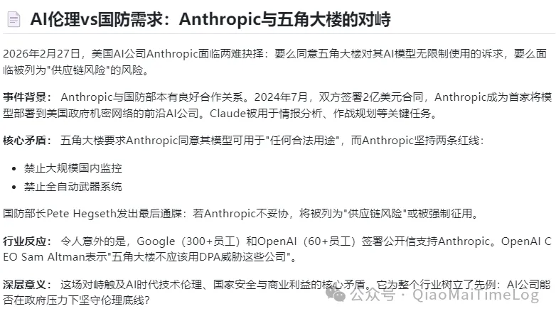 结构清晰:生成的简报包含事件背景、核心矛盾(大规模监控与全自动武器系统)、行业反应(Google 与 OpenAI 的声援)以及深层意义。