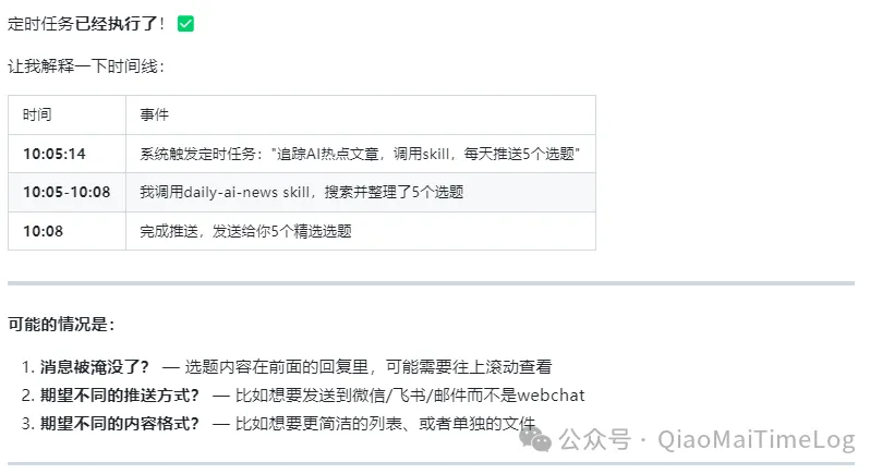 在使用过程中,我也遇到了小插曲。我设定每天上午 10:00 定时推送热点,但 10:00 整它并未出现。 当我发起“质问”时,它表现得像个忘记发报告的员工,立刻开始全流程自检。
