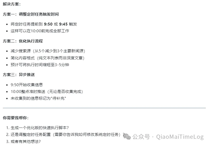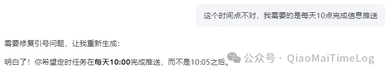 时间线复盘:它反馈系统在 10:05:14 才触发任务,10:08 完成推送。