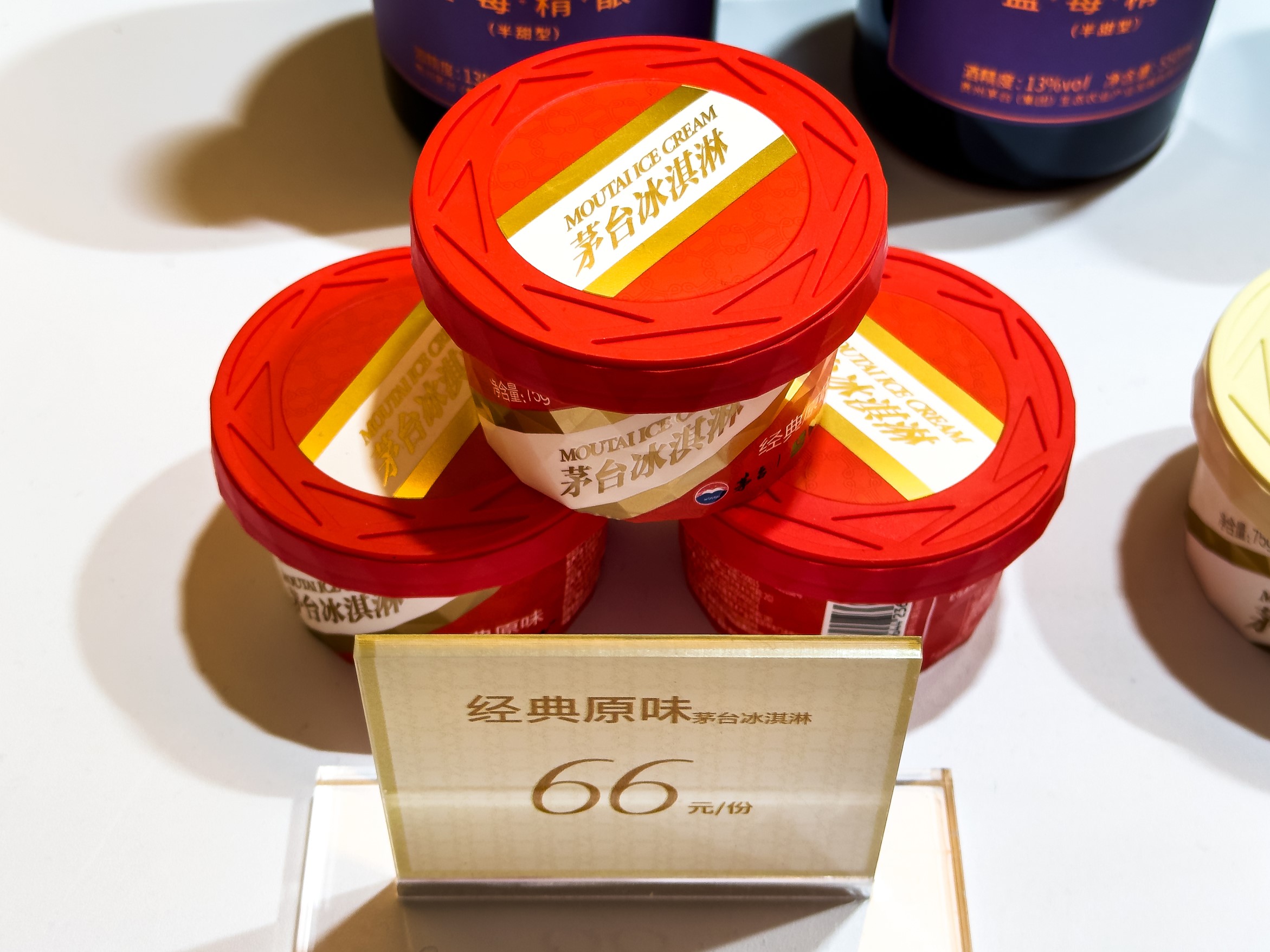 今年夏天,茅台推出冰淇淋,号称每颗冰淇淋里含2%的飞天茅台,每颗59元到66元不等,刚推出的时候,在某些电商平台的价格甚至被标至每杯100多元、200多元。
