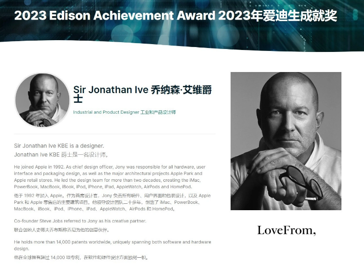 据IT之家,前苹果设计总监乔纳森・埃维近日荣获了2023年的爱迪生成就奖(Edison Achievement Award)。该奖项主要表彰在新产品和服务开发、营销、设计和创新等方面有卓越表现的人物。乔纳森・埃维于1992年9月加入苹果公司,帮助设计了iMac、iPad、MacBook和其他产品。此外他还帮助设计了Apple Park、Apple Store等苹果主要建筑项目。
