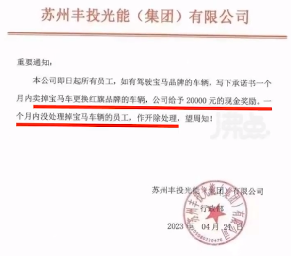 据九派,网传某公司发布一则通知,要求公司驾驶宝马品牌车辆的员工一个月内卖掉,更换国产车,公司将给予2万元现金奖励,一个月内未处理掉宝马车辆的员工将作开除处理,引起广泛关注。4月22日,该公司一员工回应称,确有收到此通知,但公司仅十几人且无人开宝马,有炒作嫌疑。