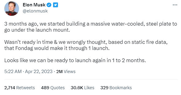 据IT之家,近日马斯克在推特回复称,“看起来太空探索技术公司(SpaceX)的‘星舰’试射可能在1到2个月内再次准备就绪”。也就是说,星舰预计将在未来的1-2个月之间再次尝试发射。
