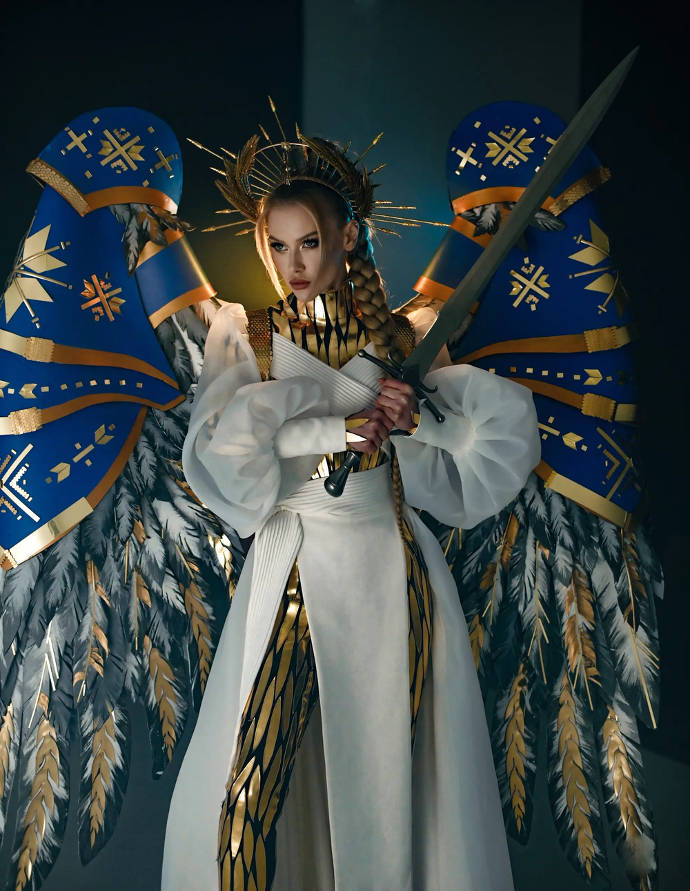 乌克兰小姐Viktoriia Apanasenko手中挥舞着一把剑,身着手工制作的礼服,其灵感来自大天使迈克尔:士兵的守护神和乌克兰首都基辅的守护神。