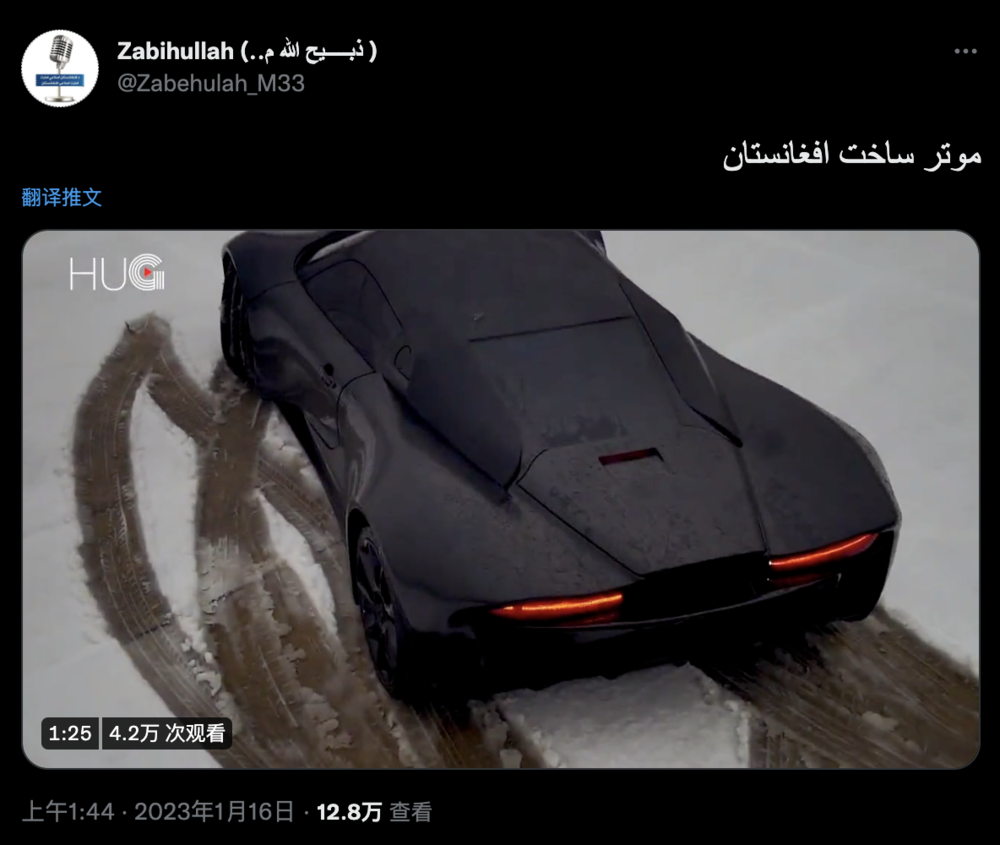 1月16日,塔利班官方发言人扎比胡拉·穆贾希德 (Zabihullah Mujahid) 在推特上分享了一段视频,画面中是一辆黑色的酷炫跑车。据《每日电讯报》报道,发言人说这辆车是阿富汗这个国家的荣誉。