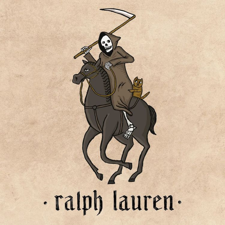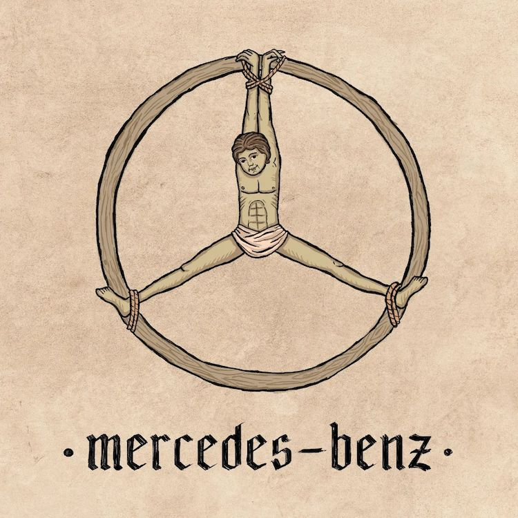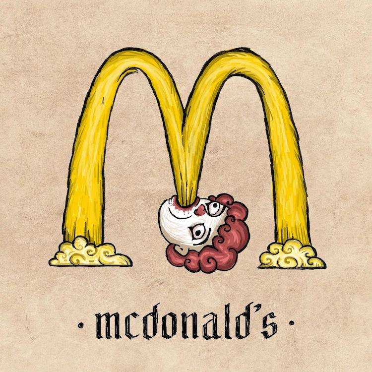 在他笔下,各大品牌LOGO都变成了可以塞进中世纪手稿中的黑暗画风。金拱门化身斩首小丑的金色喷泉,肯德基变成头顶白羽鸡的扑克绅士,奔驰是酷刑轮上的赤身人偶,亚马逊的微笑是空中的箭矢。