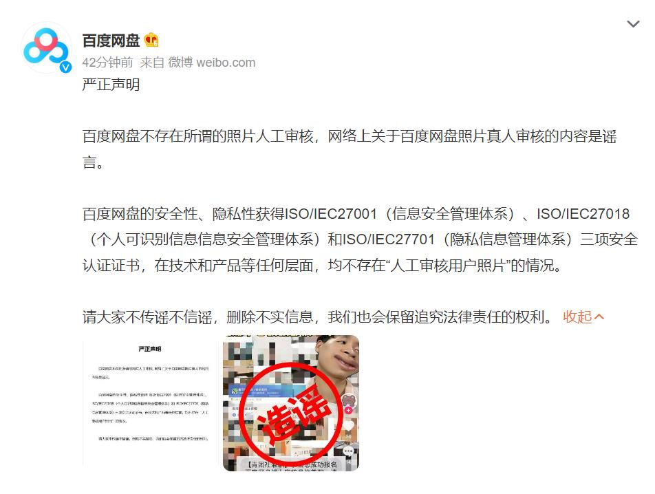 【百度网盘否认人工审核】据界面新闻, 8月18日晚,有网友贴出一名博主的视频截图,该视频自称获得百度网盘线上审核的职位,200元一天,并贴出打码的疑似百度网盘中的女生照片。网帖引发广泛传播与质疑,网友纷纷表示这是“泄露隐私”、“有什么权利审核”、“要关闭同步网盘”。对此,百度网盘声明称不存在所谓的照片人工审核,网络上关于百度网盘照片真人审核的内容是谣言,会保留追究法律责任的权利。