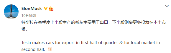【马斯克透露特斯拉汽车策略】据新浪科技,特斯拉CEO埃隆·马斯克(Elon Musk)在社交平台透露,特斯拉在每季度上半段生产的新车主要用于出口,下半段则会更多投放在本土市场。