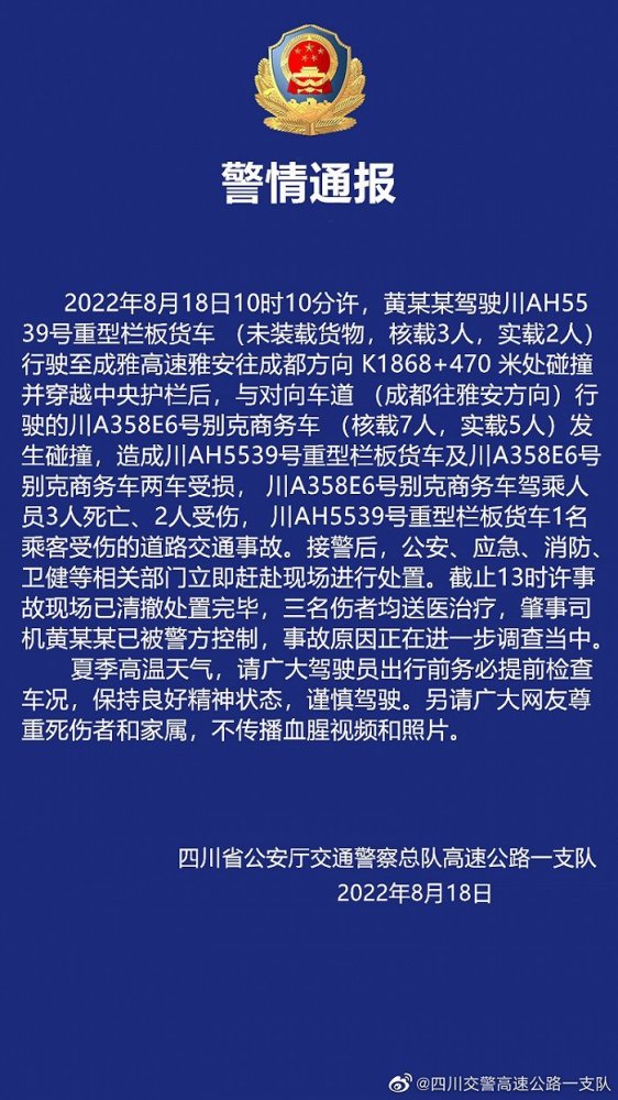 据环球网,2022年8月18日10时10分许,黄某某驾驶川AH5539号重型栏板货车 (未装载货物,核载3人,实载2人)行驶至成雅高速雅安往成都方向 K1868+470 米处碰撞并穿越中央护栏后,与对向车道(成都往雅安方向)行驶的川A358E6号别克商务车(核载7人,实载5人)发生碰撞,造成川AH5539号重型栏板货车及川A358E6号别克商务车两车受损,川A358E6号别克商务车驾乘人员3人死亡、2人受伤,川AH5539号重型栏板货车1名乘客受伤的道路交通事故。接警后,公安、应急、消防。卫健等相关部门立即赶赴现场进行处置。截止13时许事故现场已清撤处置完毕,三名伤者均送医治疗,肇事司机黄某某已被警方控制,事故原因正在进一步调查当中。