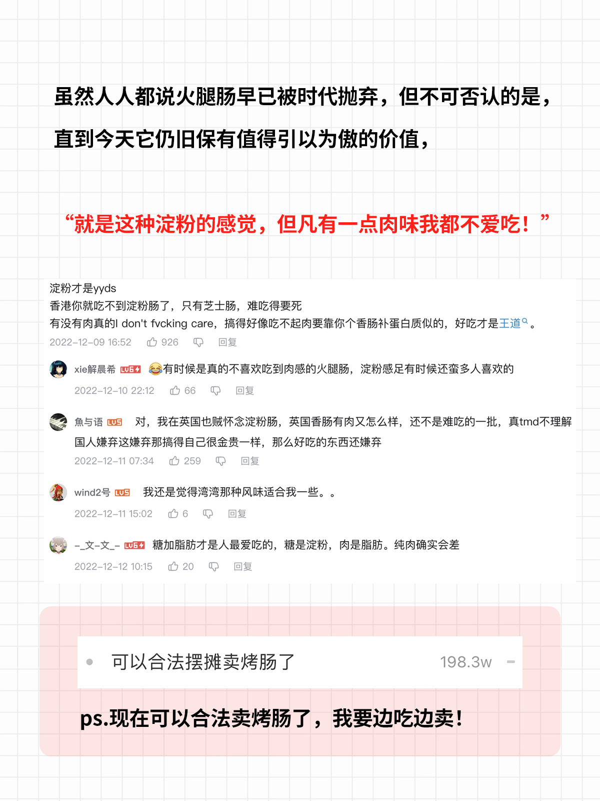 火腿肠你喜欢淀粉肠还是肉肠?(单选)A:淀粉肠! barB:肉多才好吃 barC:不喜欢吃肠 bar投票2023-05-16 00:00:00 枪枪今天吃什么: 人人都说火腿肠早已被时代抛弃,但不可否认的是,直到今天,它仍旧保有值得引以为傲的价值,不论是在特殊情况下成为最佳支援,还是给予每一个人花一块钱就能享有的快乐。
