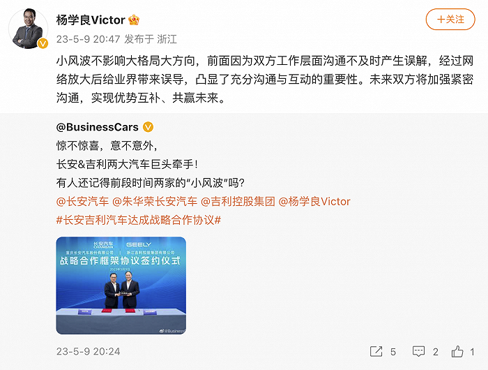据界面,5月9日晚,吉利控股集团官微宣布与长安汽车签署战略合作框架协议。随后,此前网传吉利银河之光涉嫌抄袭长安汽车的“小风波”再度被提起。当晚,吉利控股集团高级副总裁杨学良通过其个人微博发文,主动就这一“小风波”做出回应。杨学良称,“小风波不影响大格局大方向,前面因为双方工作层面沟通不及时产生误解,经过网络放大后给业界带来误导,凸显了充分沟通与互动的重要性。未来双方将加强紧密沟通,实现优势互补、共赢未来。”