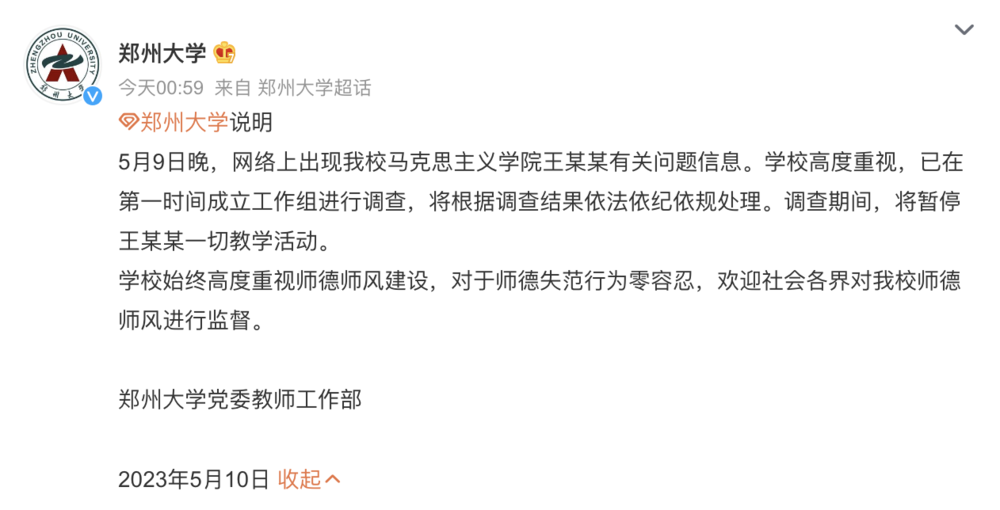 近日,有网友爆料称自己在11年前遭郑州大学一老师PUA长达两年半,遭侵犯致怀孕后还被其带去医院打胎。10日凌晨,郑州大学党委教师工作部回应此事:学校高度重视,已在第一时间成立工作组进行调查,将根据调查结果依法依纪依规处理。调查期间,将暂停王某某一切教学活动。学校始终高度重视师德师风建设,对于师德失范行为零容忍。