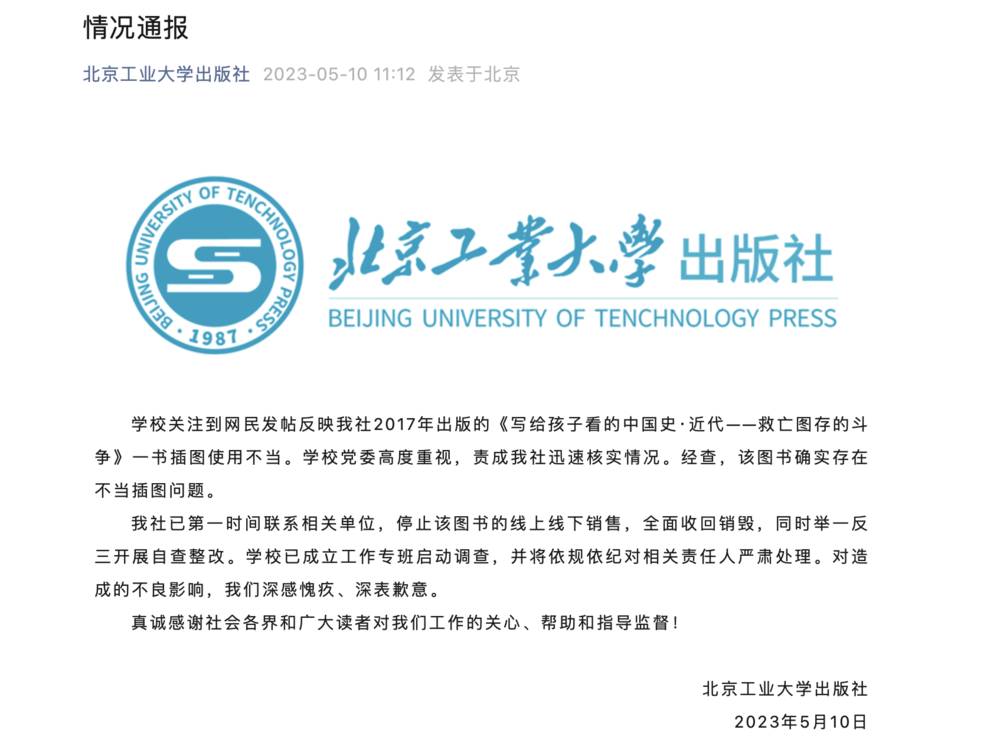 北京工业大学出版社官微发布情况通报: 学校关注到网民发帖反映我社2017年出版的《写给孩子看的中国史·近代——救亡图存的斗争》一书插图使用不当。学校党委高度重视,责成我社迅速核实情况。经查,该图书确实存在不当插图问题。