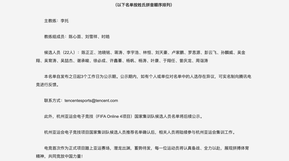 杭州亚运会电子竞技(FIFA Online 4项目)国家集训队候选人员名单将后续公示。