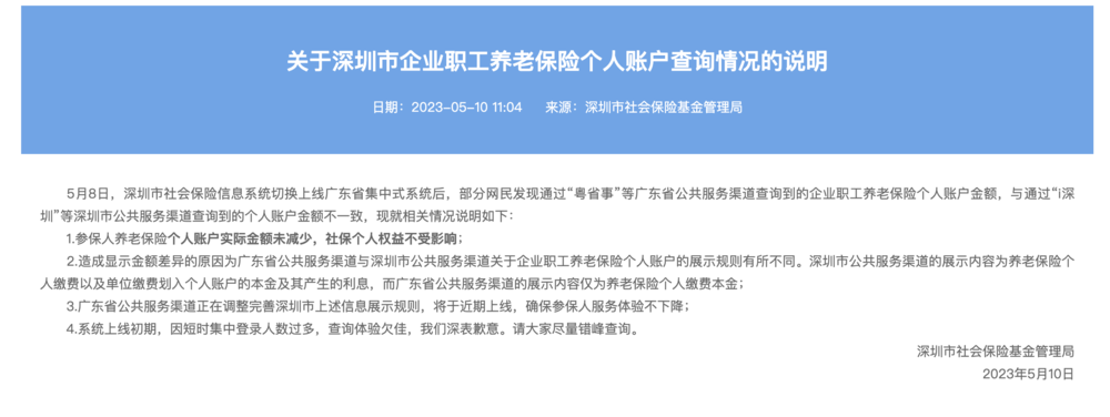 深圳市社会保险基金管理局今日发布关于深圳市企业职工养老保险个人账户查询情况的说明称,5月8日,深圳市社会保险信息系统切换上线广东省集中式系统后,部分网民发现通过“粤省事”等广东省公共服务渠道查询到的企业职工养老保险个人账户金额,与通过“i深圳”等深圳市公共服务渠道查询到的个人账户金额不一致,现就相关情况说明如下:参保人养老保险个人账户实际金额未减少,社保个人权益不受影响;造成显示金额差异的原因为广东省公共服务渠道与深圳市公共服务渠道关于企业职工养老保险个人账户的展示规则有所不同。深圳市公共服务渠道的展示内容为养老保险个人缴费以及单位缴费划入个人账户的本金及其产生的利息,而广东省公共服务渠道的展示内容仅为养老保险个人缴费本金。广东省公共服务渠道正在调整完善深圳市上述信息展示规则,将于近期上线,确保参保人服务体验不下降。