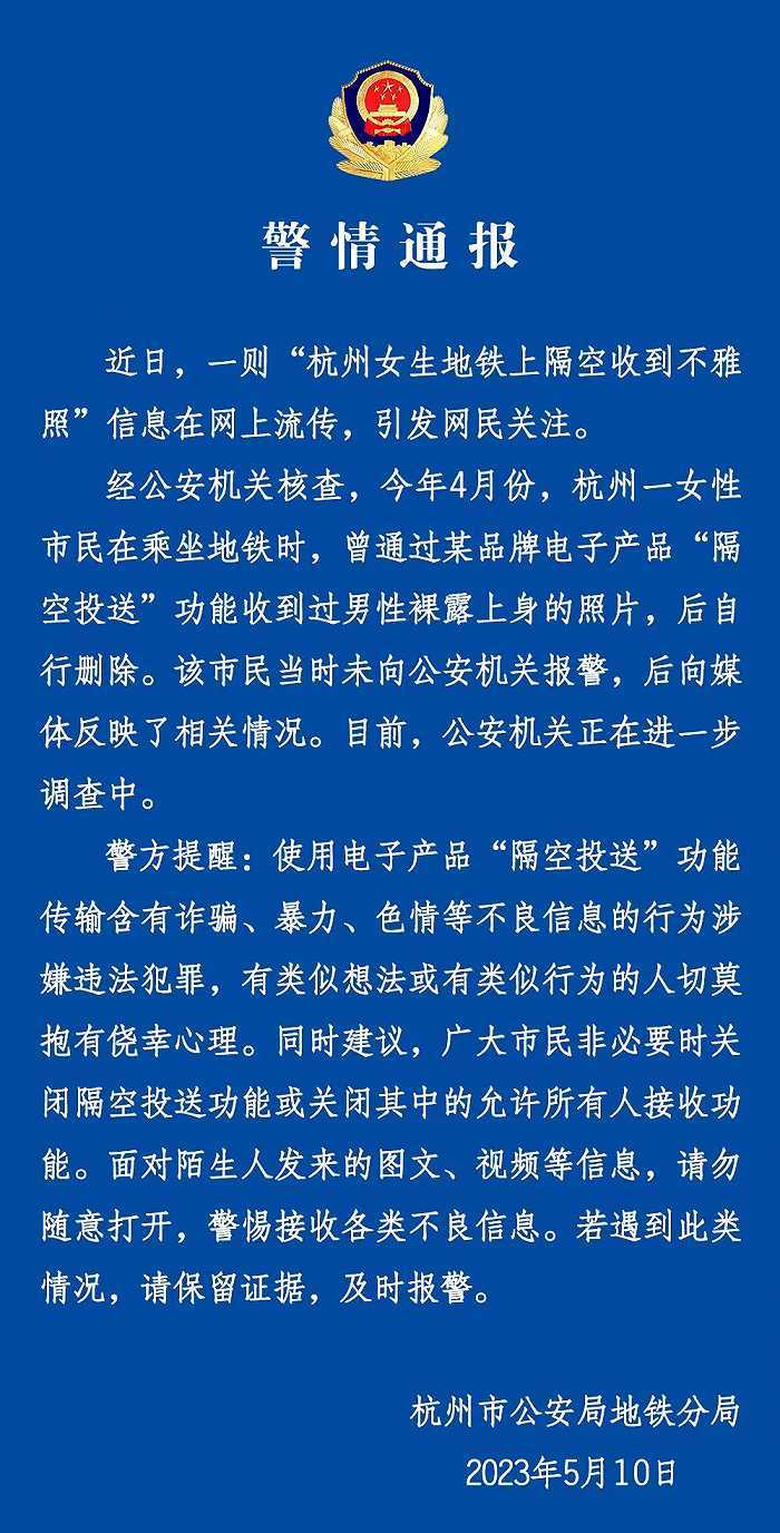 5月10日,据平安杭州地铁公众号消息,杭州市公安局地铁分局发布警情通报:近日,一则“杭州女生地铁上隔空收到不雅照”信息在网上流传,引发网民关注。经公安机关核查,今年4月份,杭州一女性市民在乘坐地铁时,曾通过某品牌电子产品“隔空投送”功能收到过男性裸露上身的照片,后自行删除。该市民当时未向公安机关报警,后向媒体反映了相关情况。目前,公安机关正在进一步调查中。