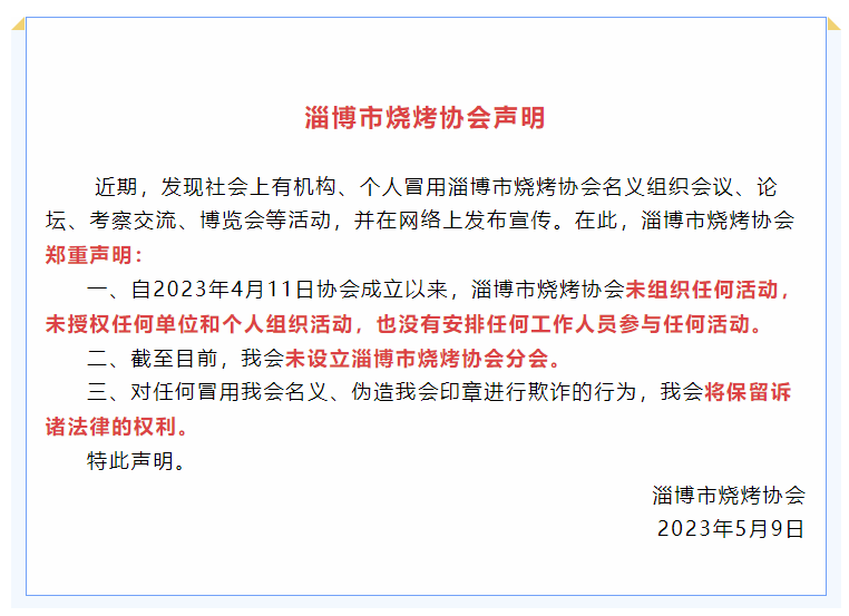 淄博市烧烤协会5月9日在其官微发布声明表示,近期,发现社会上有机构、个人冒用淄博市烧烤协会名义组织会议、论坛、考察交流、博览会等活动,并在网络上发布宣传。在此,淄博市烧烤协会郑重声明: