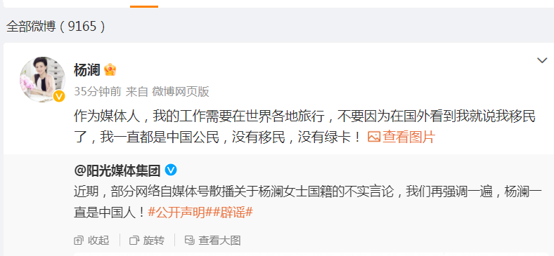 据每经,阳光集团官方微博5月10日发布声明,近期,部分网络自媒体号散播关于杨澜女士国籍的不实言论,我们再强调一遍,杨澜一直是中国人!