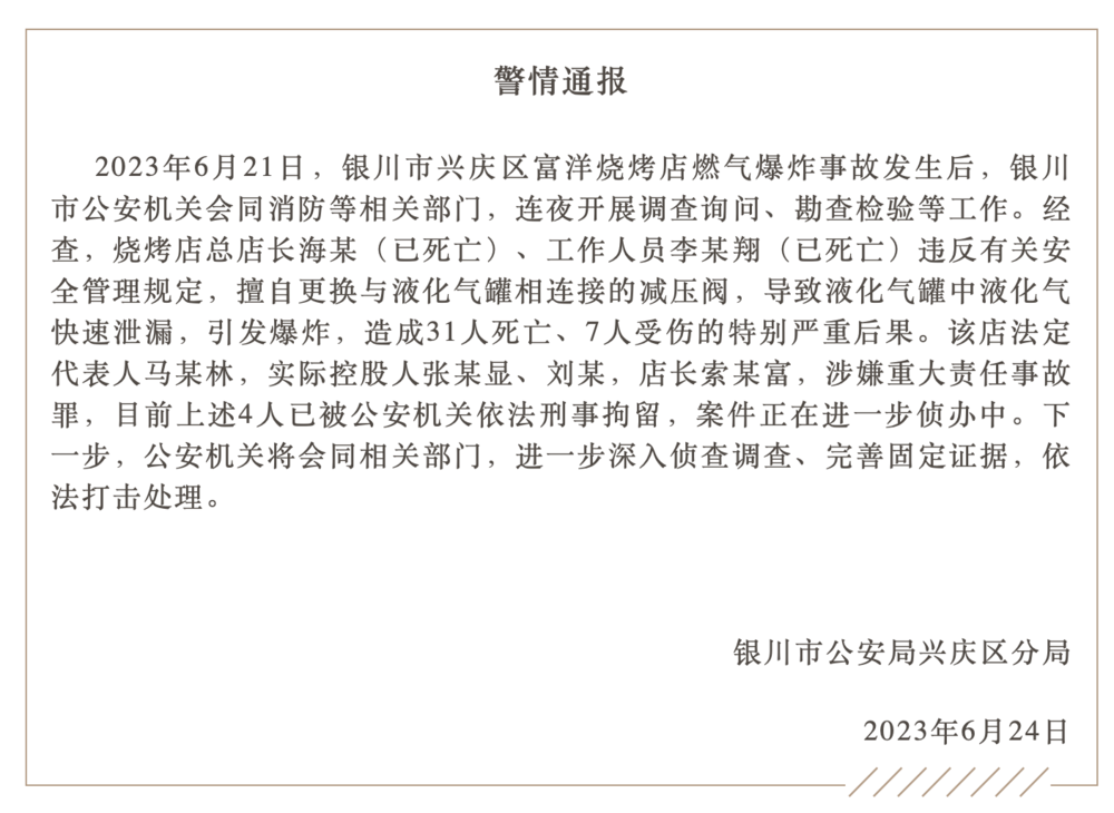 据宁夏广电新闻中心,2023年6月21日,银川市兴庆区富洋烧烤店燃气爆炸事故发生后,银川市公安机关会同消防等相关部门,连夜开展调查询问、勘查检验等工作。经查,烧烤店总店长海某(已死亡)、工作人员李某翔(已死亡)违反有关安全管理规定,擅自更换与液化气罐相连接的减压阀,导致液化气罐中液化气快速泄漏,引发爆炸,造成31人死亡、7人受伤的特别严重后果。该店法定代表人马某林,实际控股人张某显、刘某,店长索某富,涉嫌重大责任事故罪,目前上述4人已被公安机关依法刑事拘留,案件正在进一步侦办中。下一步,公安机关将会同相关部门,进一步深入侦查调查、完善固定证据,依法打击处理。