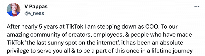 据界面,当地时间6月22日,TikTok首席运营官瓦妮莎·帕帕斯在推特上宣布将卸任。她表示,“对于我们了不起的创作者、员工和让TikTok成为‘互联网上最后一个阳光明媚的地方’的人们来说,能够为你们所有人服务,我感到十分荣幸。”