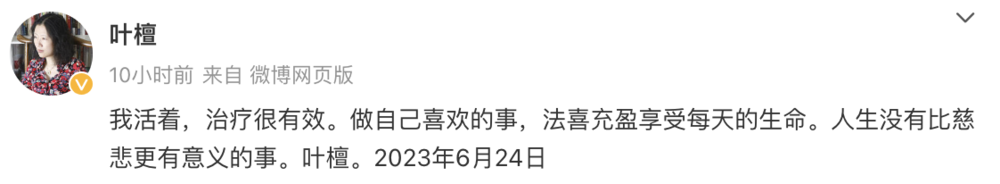 据沸点视频,近日,有网友发文称财经评论家、财经专栏作家叶檀因病去世。6月24日,叶檀在微博发文辟谣:“我活着,治疗很有效。做自己喜欢的事,法喜充盈享受每天的生命。人生没有比慈悲更有意义的事。”此前,4月24日,知名财经作家叶檀发布视频,自述罹患乳腺癌9个月的“至暗时刻”。