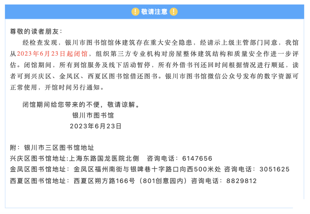 据银川市图书馆,6月23日凌晨,银川市图书馆公众号发布公告称,经检查发现,银川市图书馆馆体建筑存在重大安全隐患,经请示上级主管部门同意,从6月23日起闭馆,组织第三方专业机构对房屋整体建筑结构和质量安全作进一步评估。闭馆期间,所有到馆服务及线下活动暂停,所有外借书刊还回时间根据情况进行顺延,读者可到兴庆区、金凤区、西夏区图书馆借还图书。银川市图书馆微信公众号发布的数字资源可正常使用,开馆时间另行通知。记者随后联系到银川市图书馆值班人员,对方回复称“现在整个银川市都在安全大检查”,银川市图书馆已经营业30多年,因为是老馆,建筑有点不安全,不让聚集人员,目前正在排查安全隐患。