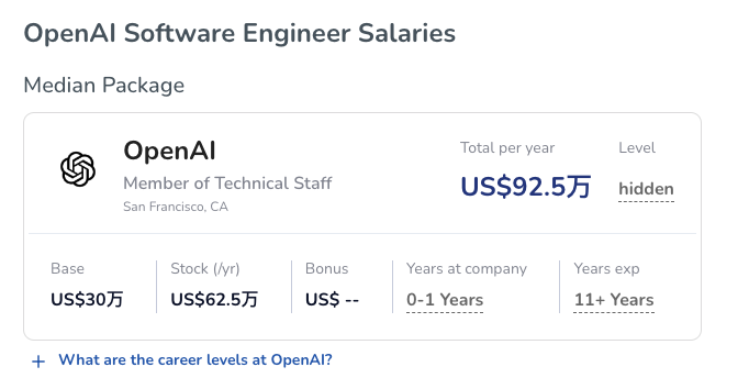 根据 level.fyi 的数据显示,OpenAI 工程师的中位数年薪资为 90 万美元,工资范围为 62 万美元至 92.5 万美元。
