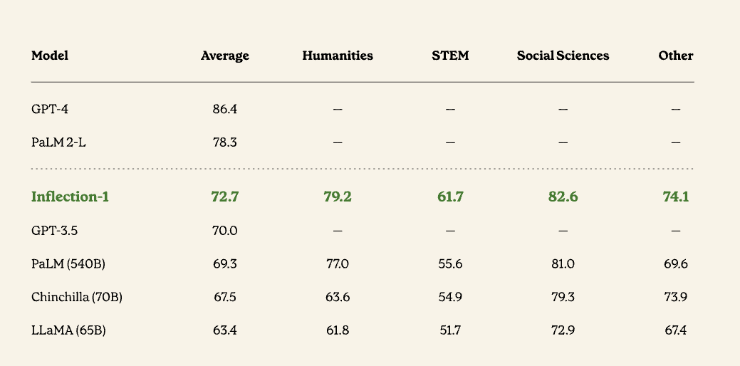 从 Inflection 公布的一些关键数据来看,Inflection-1 在多任务语言理解这一指标上超过了 Meta 的 LLaMA、 GPT 3.5 和 Google 的 PalM 540B,表现亮眼。