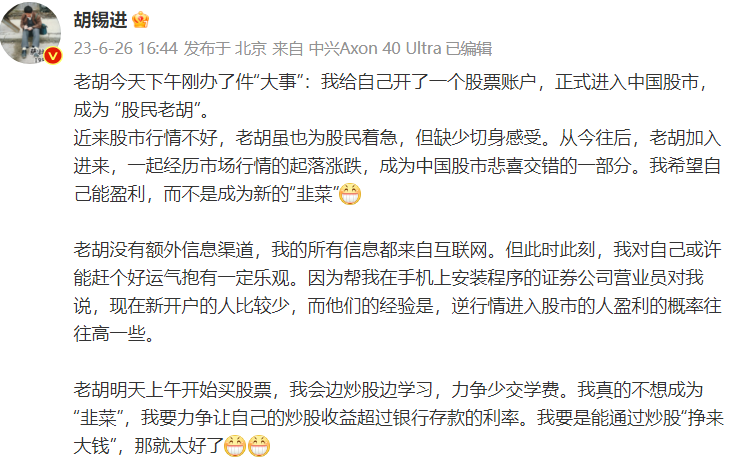 6月26日,媒体人胡锡进在其个人微博上发文称,自己开了股票账户,正式进入中国股市。胡锡进表示,“从今往后,老胡加入进来,一起经历市场行情的起落涨跌,成为中国股市悲喜交错的一部分”。“老胡明天上午开始买股票,我会边炒股边学习,力争少交学费。”