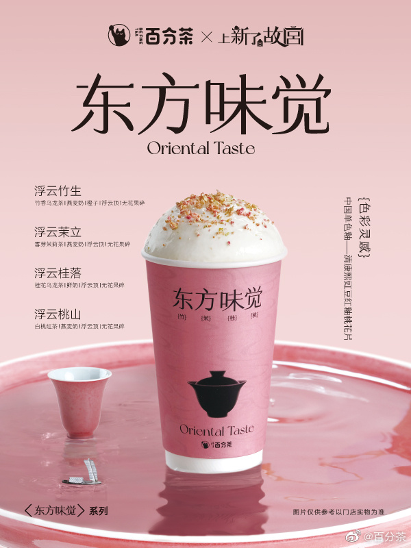6月30日,百分茶联名上新了故宫,正式推出「东方味觉」系列,新增伯虎桃山、桂落满陇两款新品。 新品包装「釉粉杯」色彩灵感来源于中国单色釉——清康熙豇豆红釉桃花片,以杯中绝色演绎东方美学。在味型上,「东方味觉」系列增加了使用“桂花乌龙”和“白桃红”两款新茶,竹生空野、茉莉绣窗和新品伯虎桃山、桂落满陇形成“竹、茉、桂、桃”四大味型。四款产品均有纯奶茶和浮云顶两个版本可选。