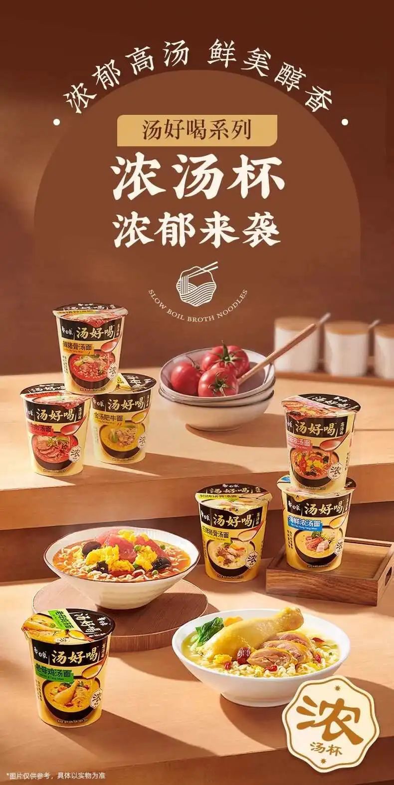 近日,白象推出全新系列汤好喝浓汤杯,主打熬制高汤包取代粉包酱包,6小时慢熬浓缩高汤精华,浓郁高汤鲜美醇香。搭配有青菜、青豆、玉米、鸡蛋等丰富配菜,营养均衡。产品共有老母鸡汤面、招牌猪骨汤面、辣牛肉汤面、海鲜浓汤面、番茄浓汤面、金汤肥牛面、辣猪骨汤面7种口味。目前天猫旗舰店售价为31.9元6杯。