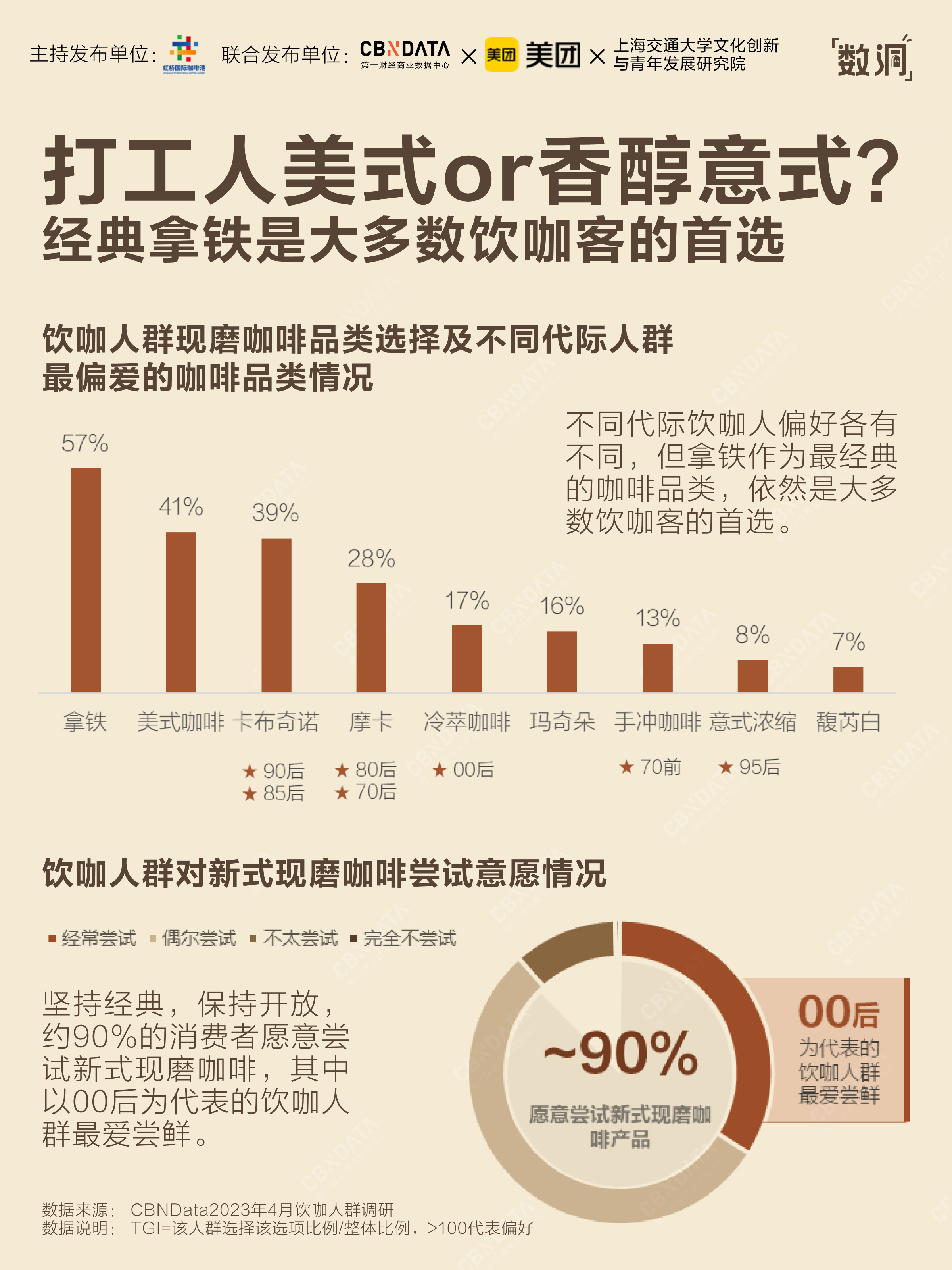 在现磨咖啡品类的选择上,经典意式“拿铁”消费占比达到57%,为消费者首选。同时约九成消费者愿尝鲜,在饮咖人群新式现磨咖啡偏好榜单中,花香味、生椰、茶味位居TOP3。