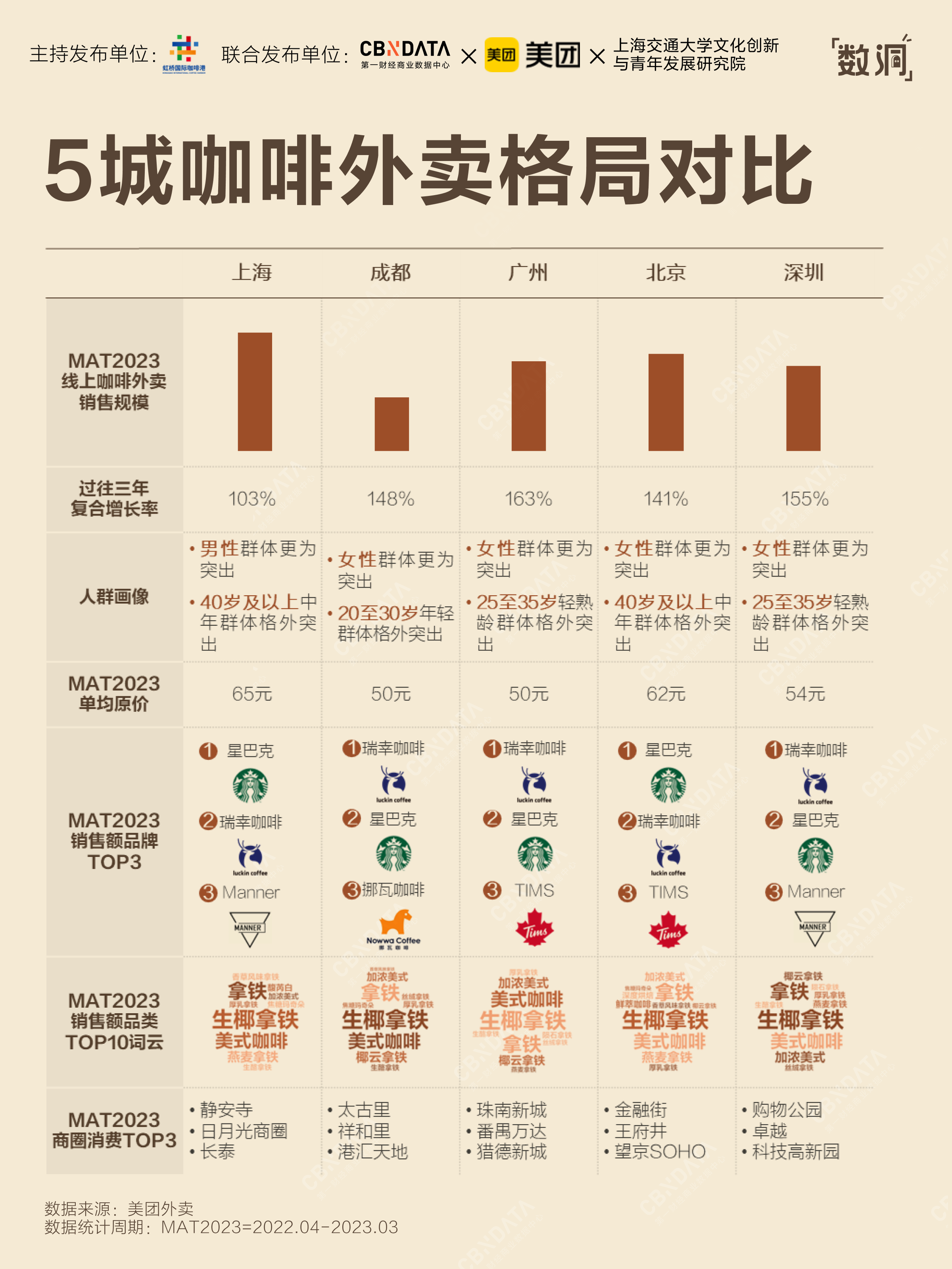 除了整体的全场景需求洞察外,CBNData还专门围绕北京、上海、广州、深圳和成都5大城市进行了围绕外卖和门店消费详细对比分析(图4/7),关注咖啡本地市场的小伙伴一定要收藏查看哦~