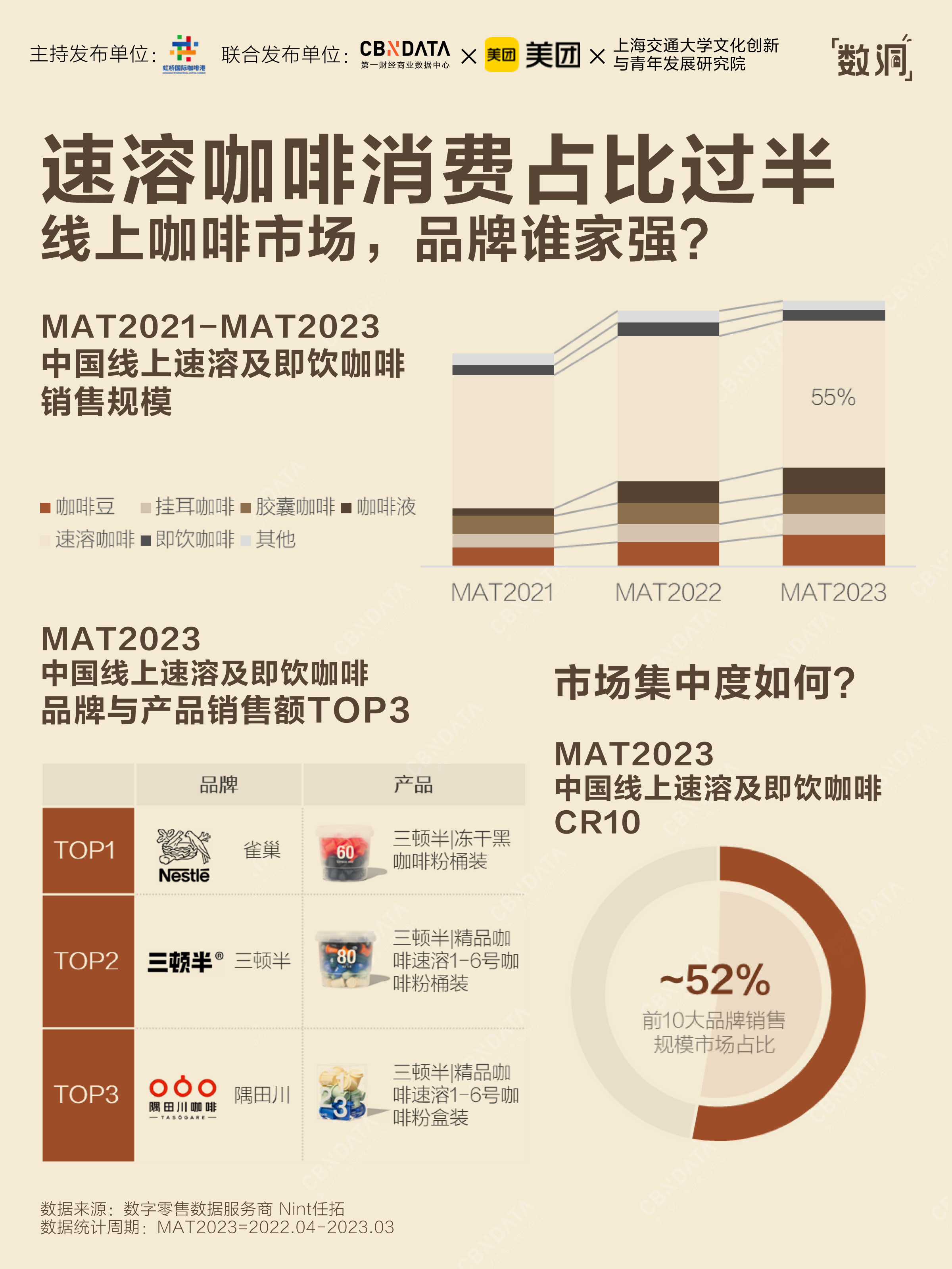 在品牌和产品层面,各细分品类的销售额TOP品牌各不相同,整体来看,传统巨头雀巢依然占据头部地位,新锐品牌三顿半、隅田川则分列二三名。