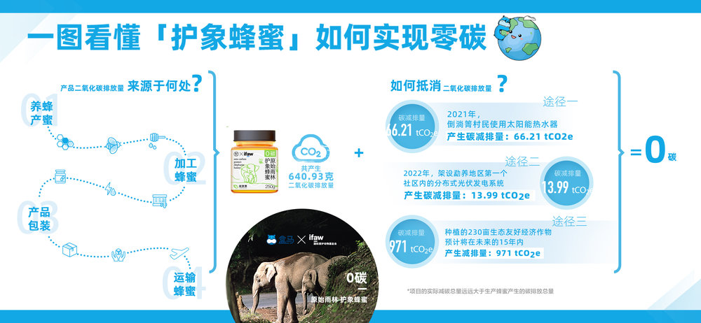 基于此项目,盒马与与IFAW开始规划为蜂蜜取得零碳认证。养蜂产蜜所产生的二氧化碳排放量来自养蜂、加工、包装、运输这四个主要环节,经过计算,每生产一罐蜂蜜,所产生的二氧化碳排放量约为640.93g。