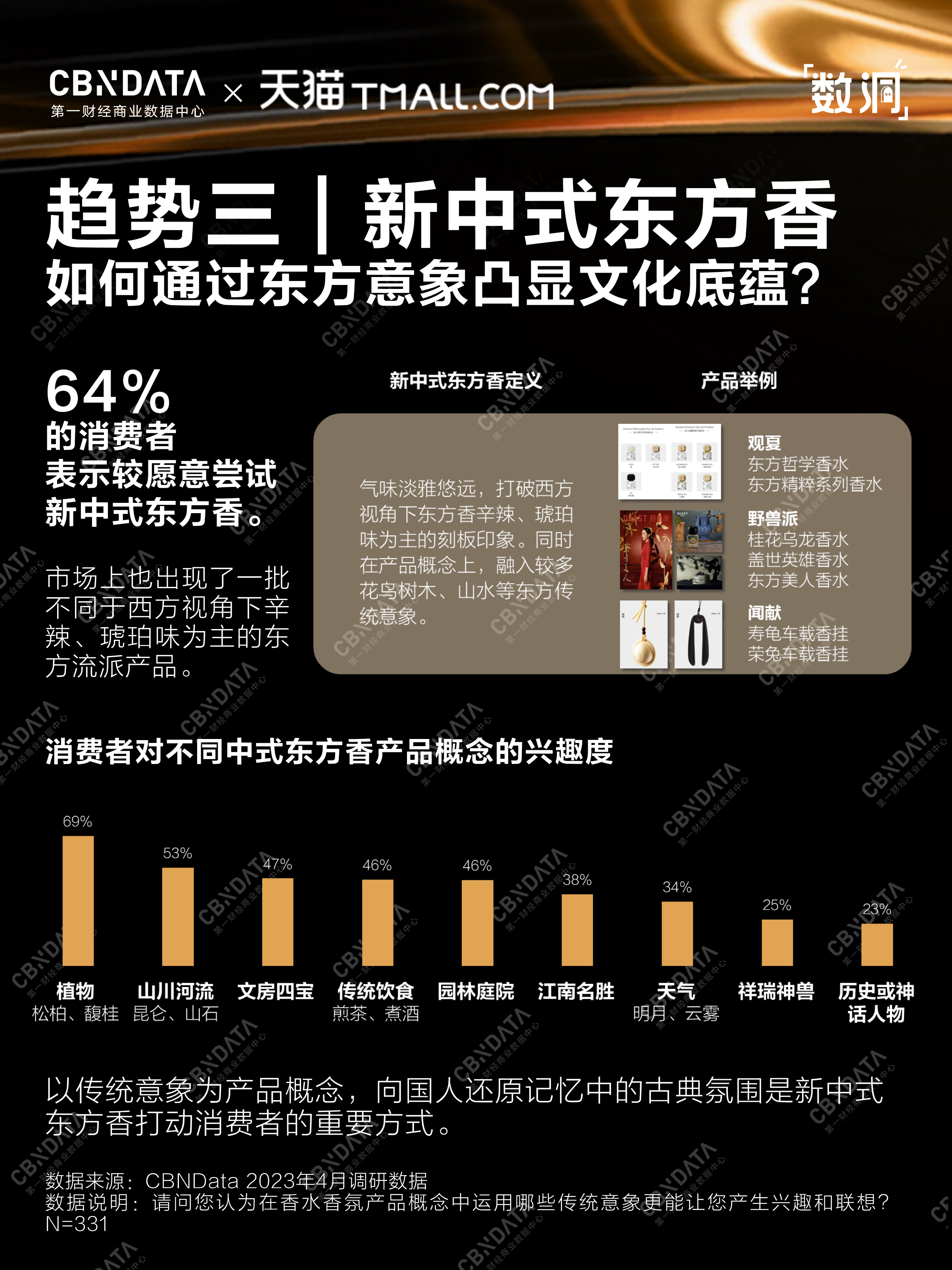 在被东方美学渗透的各个消费领域中,香水香氛成为最具吸引力的品类,64%的消费者表示较愿意尝试新中式东方香。