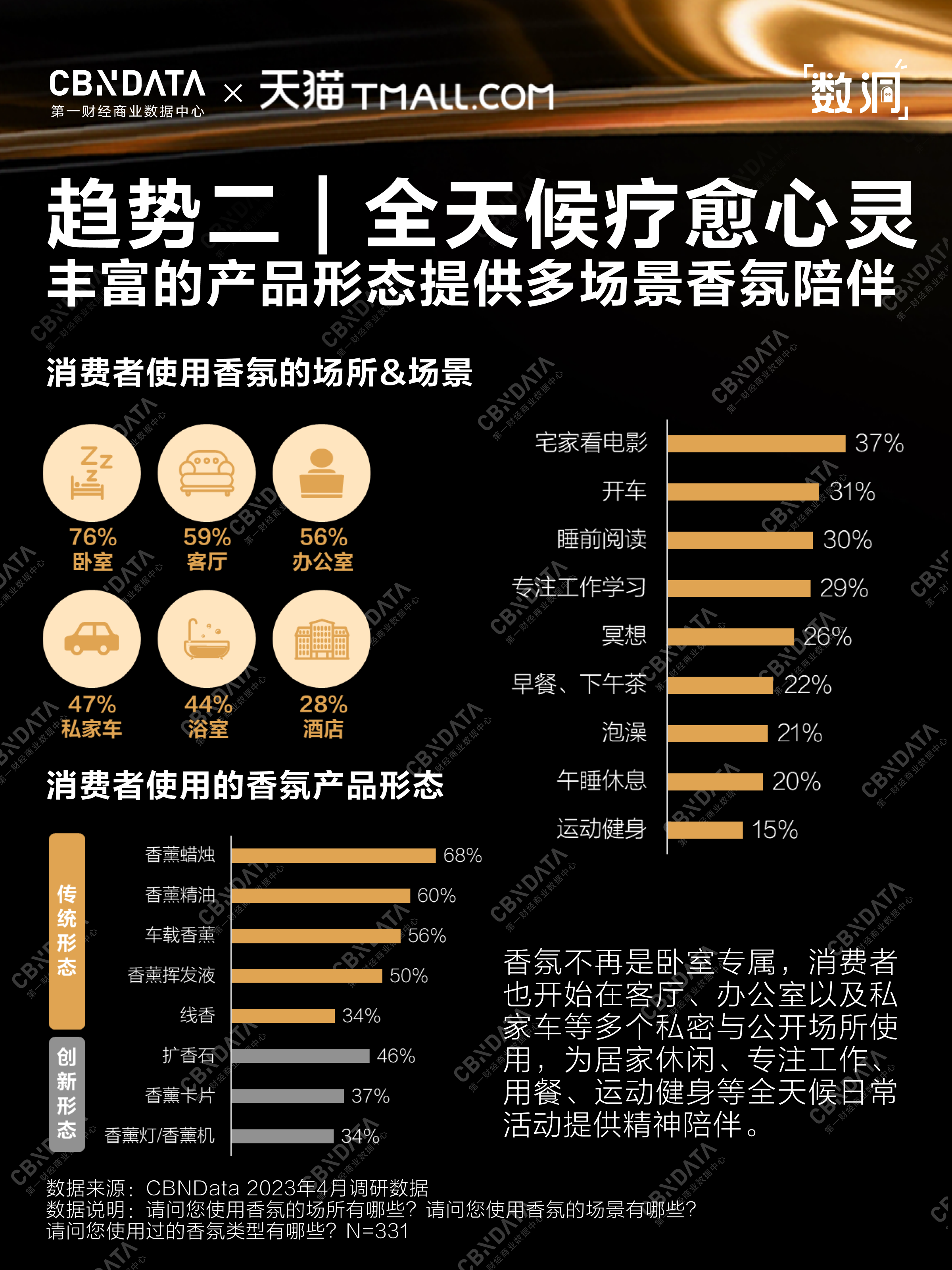 对香氛产品而言,它不再是卧室专属,消费者已开始在客厅、办公室以及私家车等多个私密与公开场所使用,香薰蜡烛、精油以及车载香薰目前最受欢迎,而消费者也开始尝试扩香石、香薰卡片等创新产品。