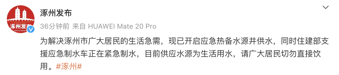 河北省保定涿州市委宣传部官方微博@涿州发布8月8日晚提醒:为解决涿州市广大居民的生活急需,现已开启应急热备水源井供水,同时住建部支援应急制水车正在紧急制水,目前供应水源为生活用水,请广大居民切勿直接饮用。