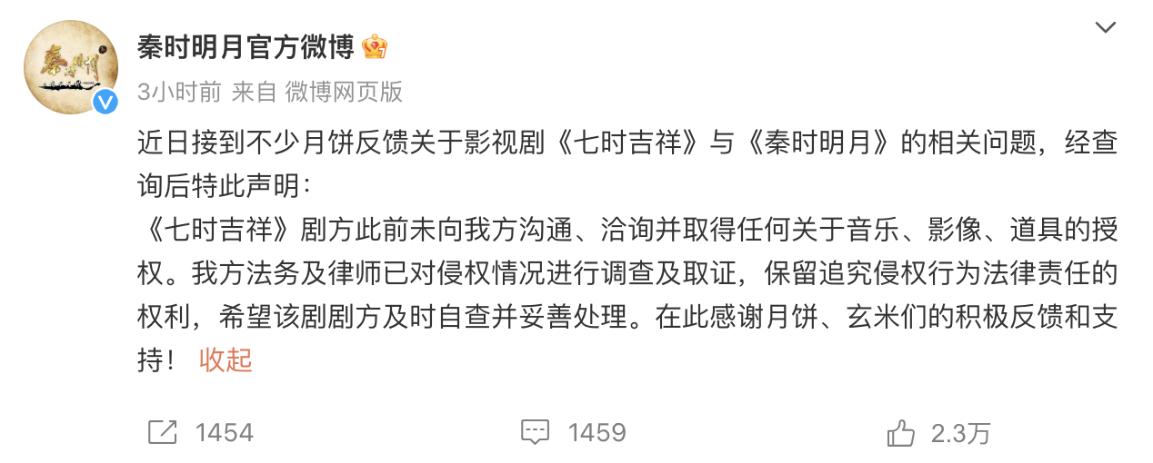 《秦时明月》官微发布声明: 近日接到不少月饼反馈关于影视剧《七时吉祥》与《秦时明月》的相关问题,经查询后特此声明: 《七时吉祥》剧方此前未向我方沟通、洽询并取得任何关于音乐、影像、道具的授权。我方法务及律师已对侵权情况进行调查及取证,保留追究侵权行为法律责任的权利,希望该剧剧方及时自查并妥善处理。