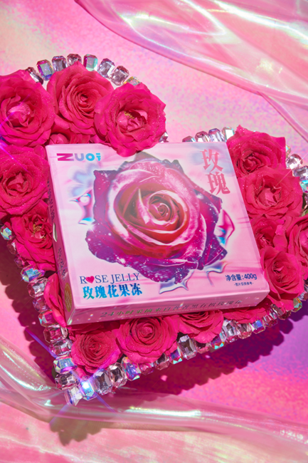 8月10日,潮流零食品牌ZUO一下推出了七夕款玫瑰花冻新品。据品牌方介绍,这款玫瑰花冻甄选云南“十大名花”普者黑有机玫瑰,一花一季一果冻,原料稀有珍贵。纯手工采摘,24小时内保鲜现制,每一颗花冻都含天然玫瑰花瓣,入口酸甜细腻,满口清甜玫瑰香,是可食用的浪漫。(来源:品牌)
