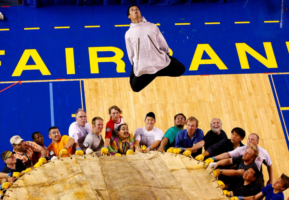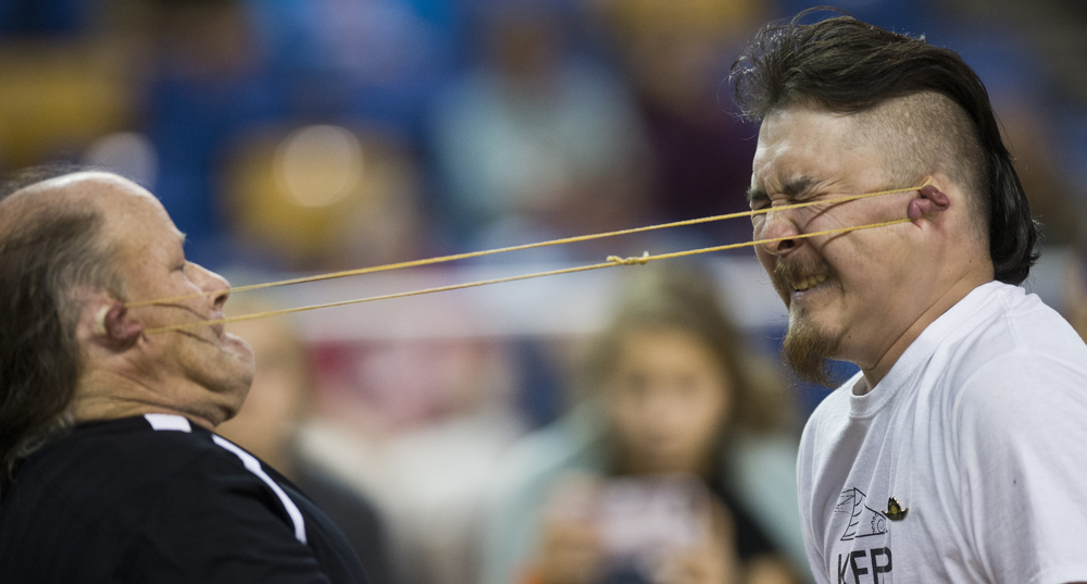 以及海豹皮抛人大赛,几十人共同操作一张巨大的海豹皮拼接皮毯,把一人抛上空中,这位升空者需要竭尽全力保持平衡。这项比赛局据说来自古老的狩猎传统,那时爱斯基摩人会抛起猎物,传递给远方的家人信号:看哦,逮到大货啦!