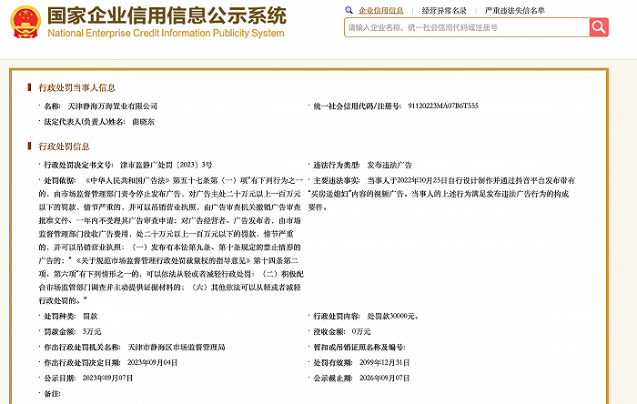 据界面新闻9月12日消息,国家企业信用信息公示系统显示,近日,天津静海万海置业有限公司因通过短视频平台发布带有“买房送媳妇”内容的视频广告,被天津市静海区市场监督管理局罚款3万元。天眼查App显示,该公司成立于2021年4月,法定代表人为曲晓东,注册资本24亿元,由万达地产集团有限公司和天津市静海城市基础设施建设投资集团有限公司分别持股60%、40%。