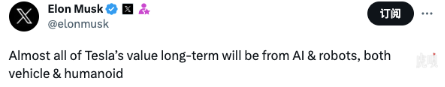 据界面新闻,马斯克9月11日在推特发帖称:“特斯拉几乎所有的长期价值都将来自AI和机器人,包括汽车和人形机器人。”