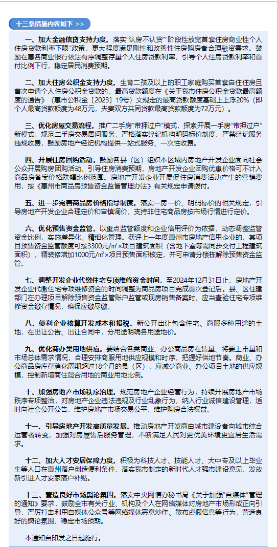 据惠州市房地产业协会,广东省惠州市住建局、自然资源局、住房公积金管理中心联合印发《关于印发促进我市房地产市场平稳健康发展若干措施的通知》。其中,《通知》提出开展住房团购活动。鼓励各县(区)组织本区域内房地产开发企业面向社会公众开展购房团购活动,引导住房消费预期,房地产开发企业团购优惠价格可不计入商品房备案价格跌幅比例范围。房地产开发企业开展促住房消费活动产生的营销费用,按《惠州市商品房预售资金监督管理办法》有关规定申请拨付。