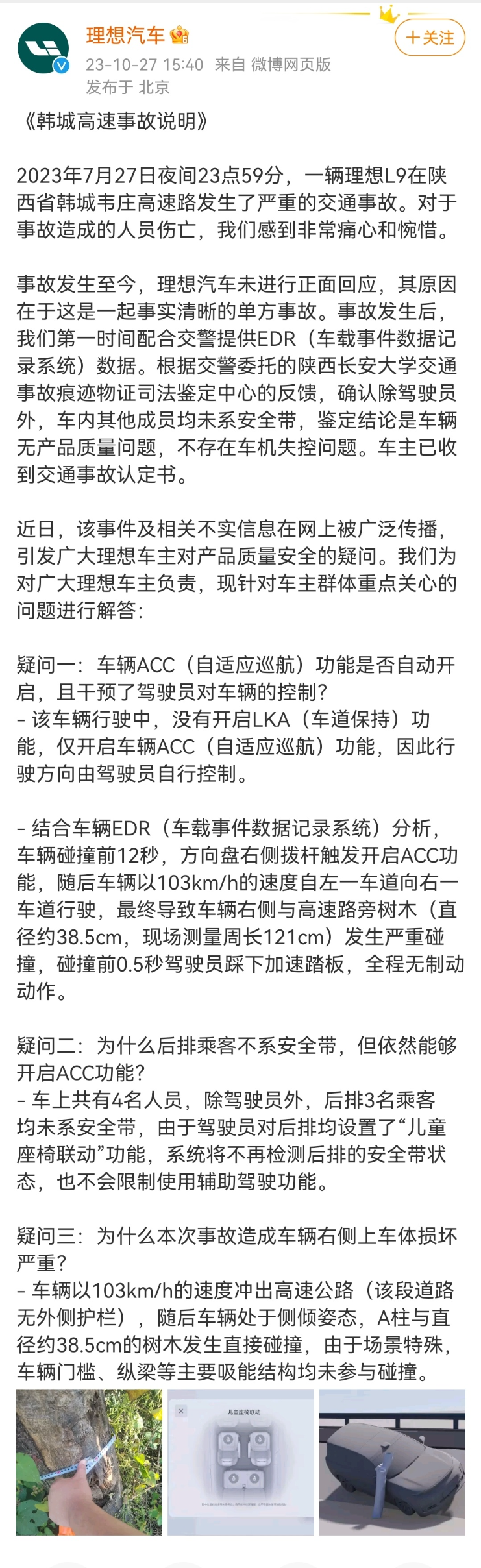 10月27日,理想汽车发布《韩城高速事故说明》。全文如下图:
