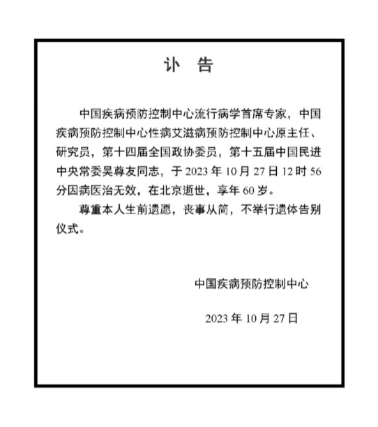 据每日经济新闻,10月27日,记者从中疾控相关负责人处了解到,中国疾控中心流行病学首席专家吴尊友今日下午因胰腺癌去世。